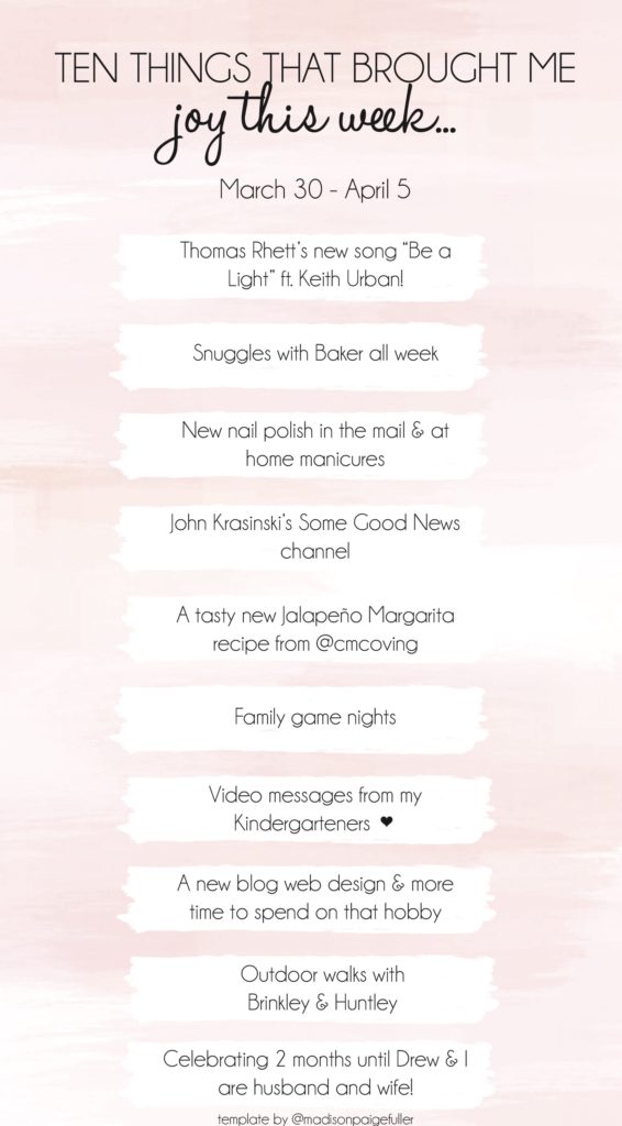 I realized today that we are nearing the one month mark since our lives were kind of turned upside down here in the states. Some days it feels like it has flown by, and others it feels like we’ve been at home for years. After seeing the contents of #4, John Krasinski’s video, I was inspired to start making a list each week of the things that brought me joy during that week. Writing down those positive, happy moments has reminded me there is so much to be grateful for.