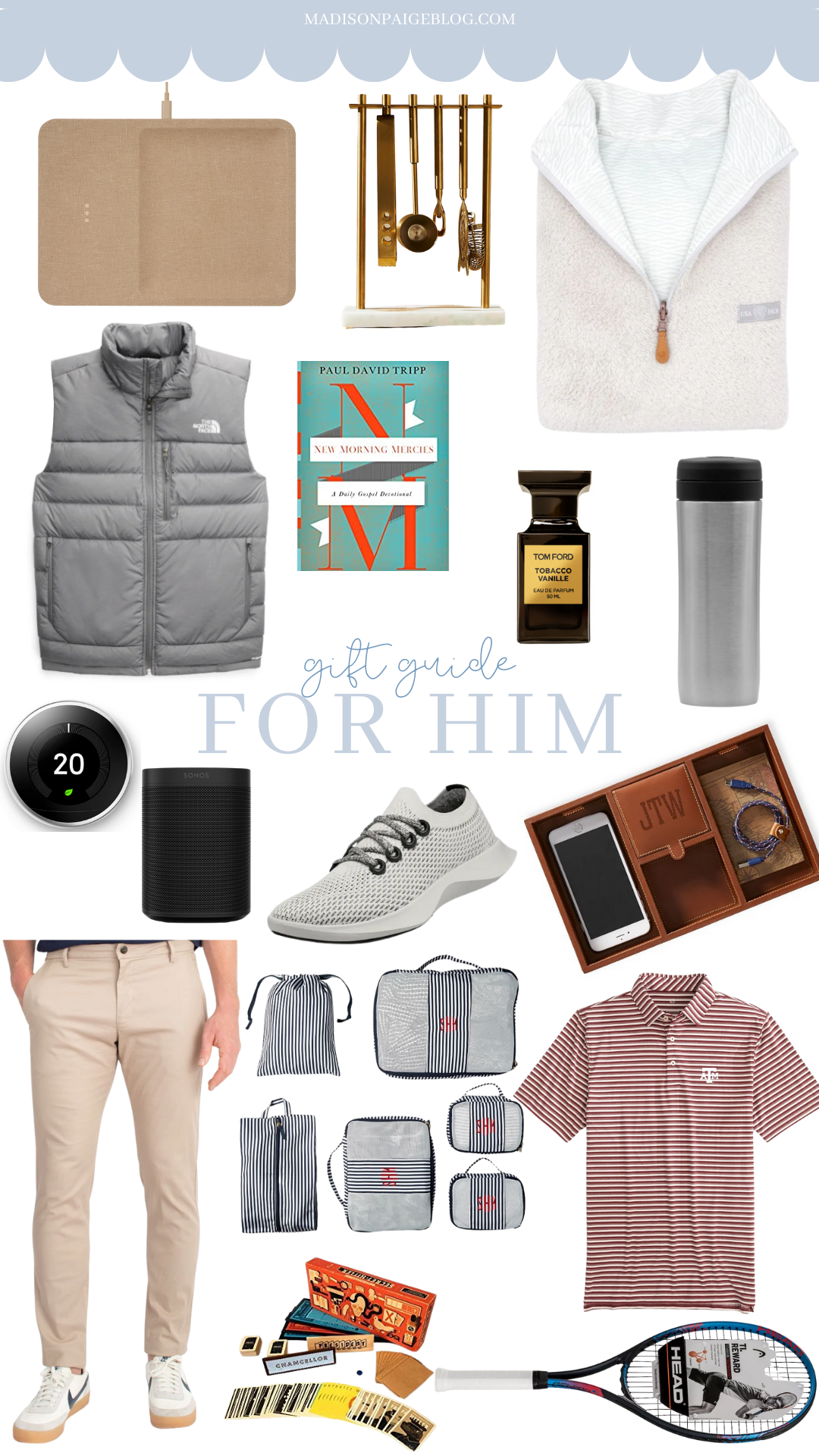 Catch Essentials Wireless Charging Tray // Gold Bar Tool Set // USA Palm Reversible Sherpa // Northface Puff Vest // New Morning Mercies Devotional // Tom Ford Cologne // Travel Coffee Press // Google Nest Thermostat // Sonos Portable Speaker // Allbirds Kilimanjaro Tennis Shoes // Leather Monogram Catchall Tray // Birddogs Khaki Pants // Monogrammed Six Piece Packing Cube Set // Southern Tide Collegiate Polo // Secret Hitler Game // Head Tennis Racket