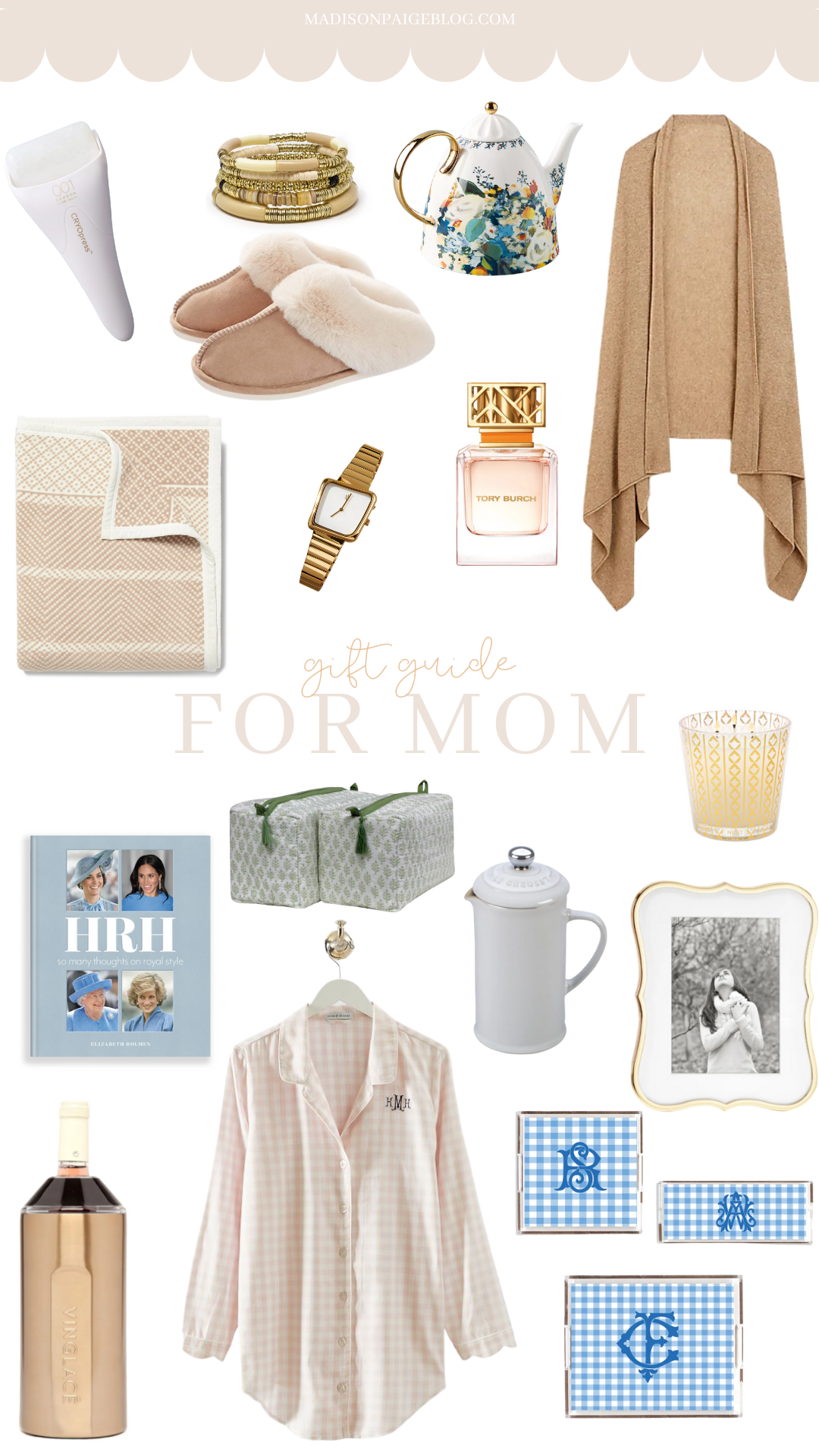 CryoPress Face Roller // Allie + Bess Natalie Fall Bracelet Stack // Floral Teapot // J.Crew Cashmere Wrap // Amazon Slippers // ChappyWrap Herringbone Beige Blanket // Gold Watch // Tory Burch Perfume // HRH Coffee Table Book // Green Cosmetic Bags // Stoneware French Press // NEST Holiday Candle // Kate Spade Scalloped Picture Frame // Monogrammed Gingham Night Shirt // Wine Chiller // Acrylic Monogrammed Gingham Trays