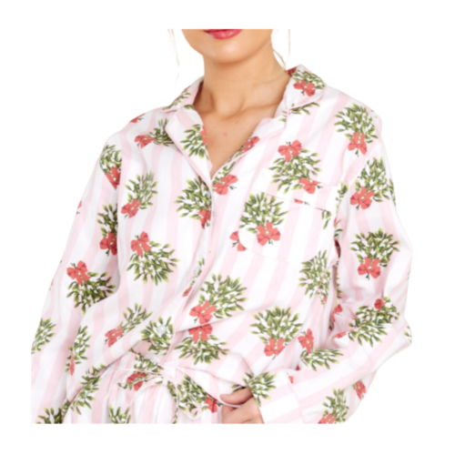 HOW CUTE! I love Christmas PJ’s. This design is feminine, classic and so stunning. I love the subtle pink and white striped background and the classic button up style. Definitely a cute pair of PJs for a party or Christmas eve!