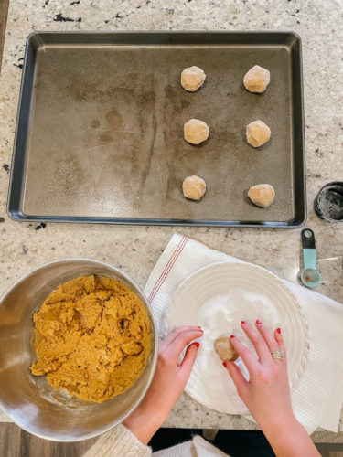 6. Pour the ½ cup sugar onto a small plate. Take 2 tablespoons of dough and roll into a ball. Roll the ball in the granulated sugar until it’s completely covered. Place 12 per cookie sheet (larger dough balls will make less cookies).