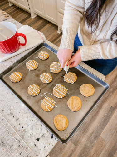 9. Once cooled, prepare white chocolate drizzle by placing white chocolate chips plus ½ teaspoon of oil in a microwave safe bowl. Microwave 30 seconds and then stir. Repeat 1-2 times until it’s completely melted. I put the melted white chocolate in a baggie and cut the tip off to drizzle across cookies.