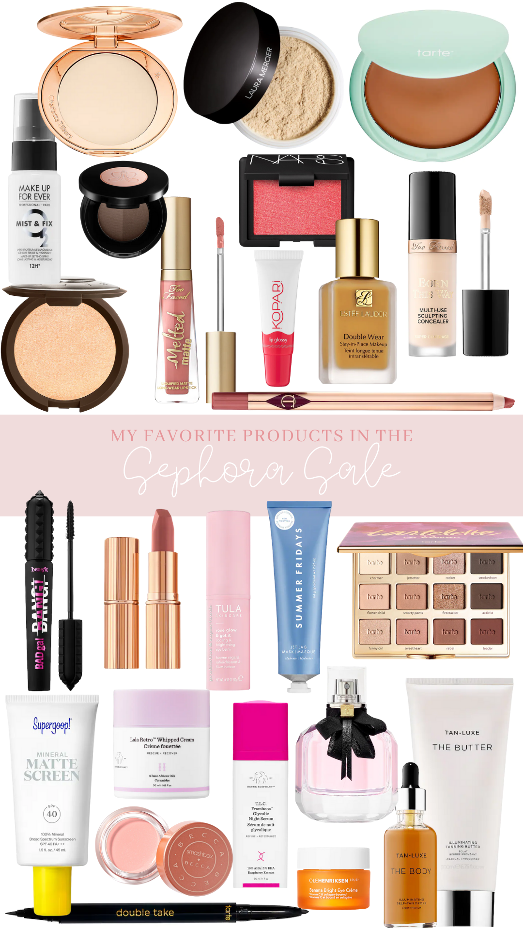 Flawless Finish Setting Powder // Laura Mercier Translucent Powder // Tarte Cream Bronzer // Setting Spray // Brow Duo // Nars Blush (shade: orgasm) // Born This Way Concealer (shade: swan) // Smashbox Highlighter // Melted Matte Lipstick // Kopari Lip Glossy // Double Wear Foundation (shade: wheat) // Pillow Talk Lip Liner // Bad Gal Bang Mascara // Pillow Talk Lipstick // Tula Rose Glow // Jet Lag Mask // In Bloom Eyeshadow Pallet // Mineral Matte Sunscreen // Whipped Cream Moisturizer // Night Serum // Perfume // Tan Luxe Butter // Tan Luxe Drops // Smashbox Under Eye Corrector // Banana Bright Eye Creme // Double Take Eyeliner