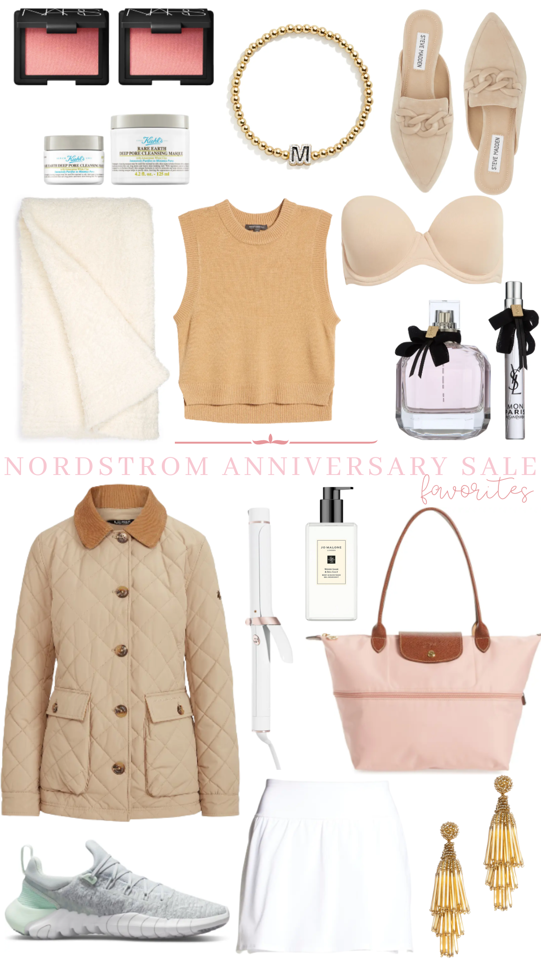 My favorite perfume, and the scent I wore in our wedding is included, along with my favorite blush, the world-famous Barefoot Dreams blanket (we own two and love), and this year’s version of the mules I bought last year and loved to wear during the fall are all included in this round-up of favorites. I also included a few things that caught my eye like this stunning quilted jacket that I just think is so chic and classic at a great price point, along with this workout skort from a great brand, and a strapless bra with raving reviews!